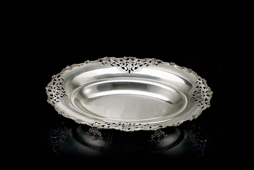 Alzata centrotavola in argento di forma ovale, con fondo liscio, tesa traforata ed incisa, e bordura, decorati a volute fogliate; quattro piedini a conchiglia con volute ed attacchi fogliati. Italia, metà sec. XX (cm 23x24,5 ca.) (gr 480 ca.)