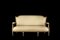 Divano con schienale leggermente curvato in legno intagliato e dorato. Braccioli e gambe scanalati. Rivestito in tessuto a righe (cm 174x80x92) (difetti alla lacca)