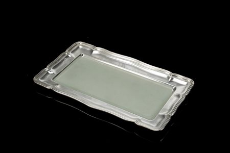 Vassoio in argento di forma rettangolare sagomata, con tesa nervata e bordura modanata; piano estraibile in vetro. Italia, metà sec. XX (cm 31x19 ca.) (gr argento 420 ca.)