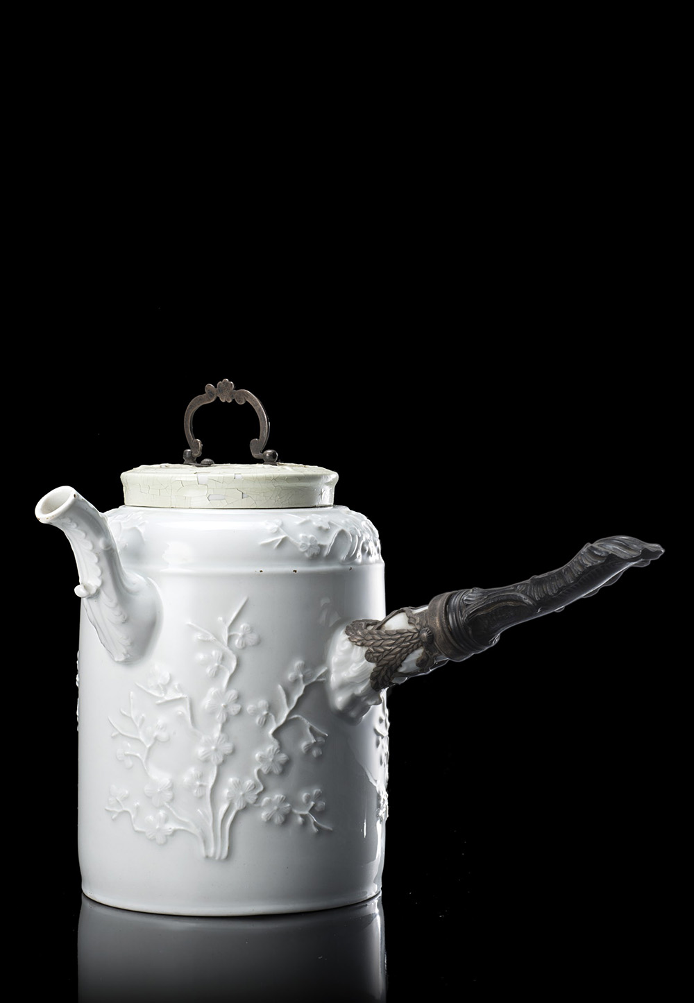 Cioccolatiera di forma cilindrica in porcellana bianca con decoro a fiori di pruno in rilievo, manico in legno tornito e argento forse di epoca posteriore. Coperchio con vecchio restauro (h. cm 18) Marca di fabbrica poco leggibile. Sec. XVIII