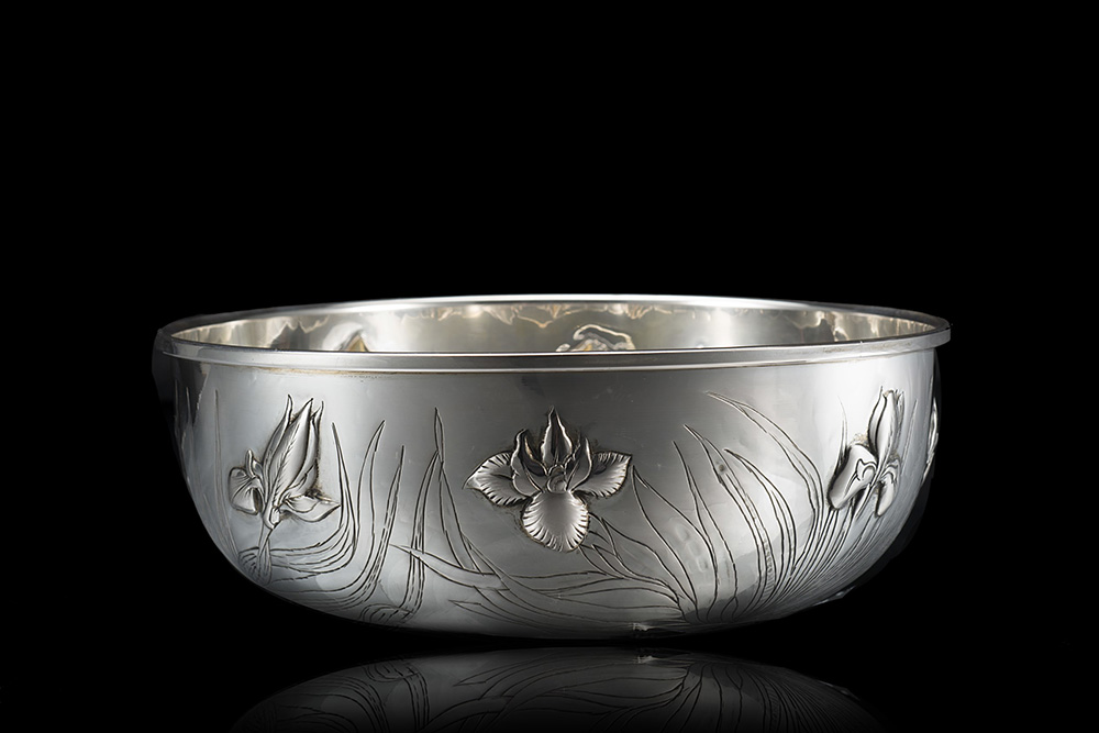 Centrotavola in argento di forma circolare decorata con gigli a sbalzo e...