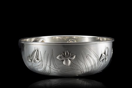 Centrotavola in argento di forma circolare decorata con gigli a sbalzo e foglie incise. Milano, metà sec. XX, argentiere Alberti Roberto (d. cm 24,5x h. cm 8,5 ca.) (gr 650 ca.) (lievi difetti)