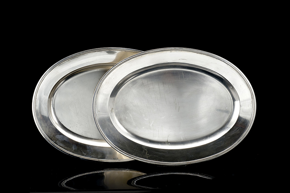 Coppia di vassoi in argento di forma ovale con superficie liscia e bordura modanata. Italia, metà sec. XX (cm 49,5x35,5 ca.) (gr tot 2930 ca.) (lievi difetti)