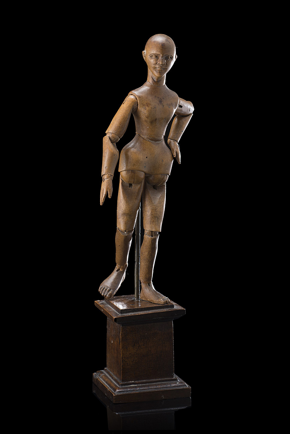 Manichino d'artista in legno, testa e arti snodabili e scolpiti, su base a plinto, fine sec. XIX (h. tot. cm 30) (minimi difetti)