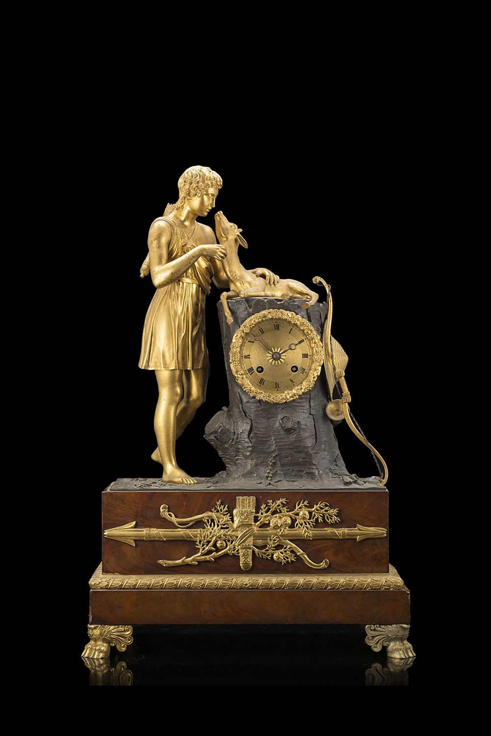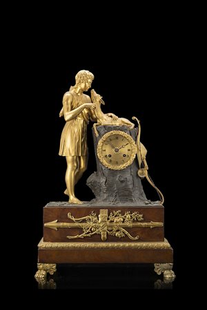 Pendola in bronzo dorato decorata con allegoria della caccia, su base in legno