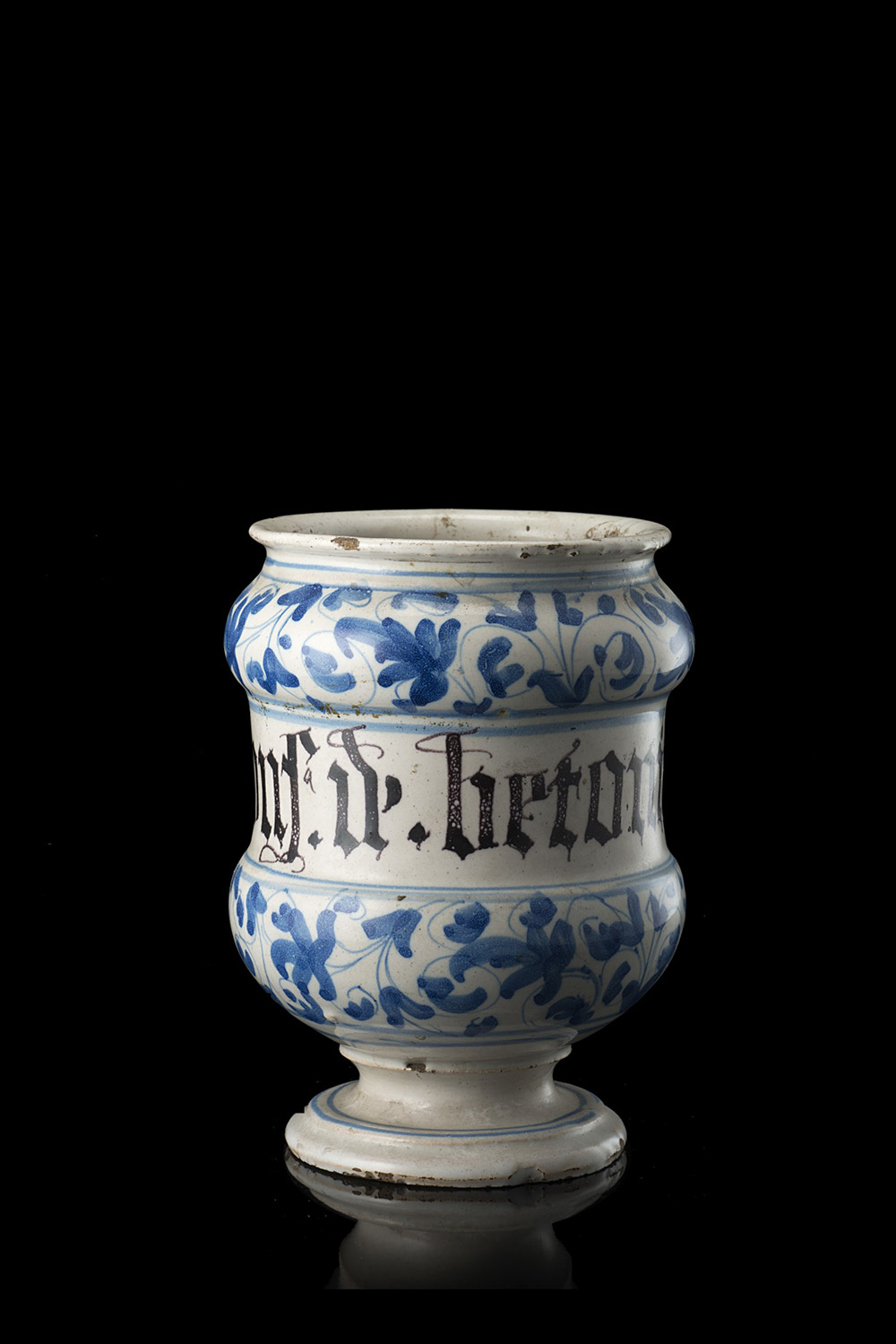 Piccolo albarello in maiolica in forma di rocchetto su piede svasato con decorazione a girali fogliati in monocromia turchina. Al centro compare la scritta farmaceutica in caratteri gotici in colore bruno. Italia settentrionale, sec. XVIII (h. cm 13) (difetti e mancanze)