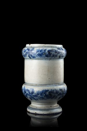 Albarello in maiolica a rocchetto su piede svasato ed espanso in monocromia blu. La parte rastremata non presenta alcun cartiglio ed è anepigrafo. Sulle spalle arrotondate compare un decoro a ghirlanda di fiori in blu. Italia settentrionale, sec. XVIII (h. cm 18,5 ca.) (difetti)