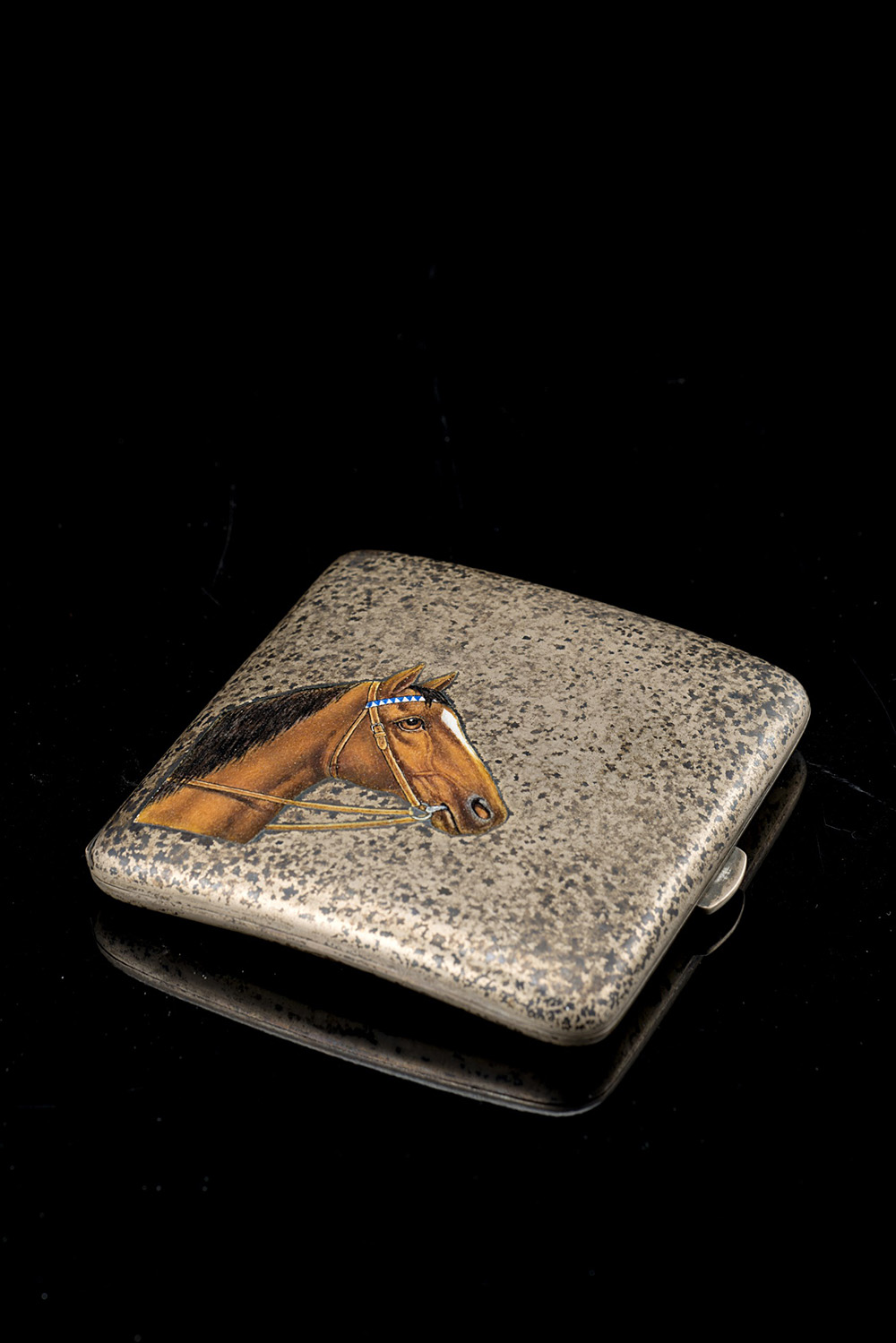 Portasigarette in argento (935/1000) di forma rettangolare con testa di cavallo smaltata in champlevè. Area germanica, inizi sec. XX (cm 7,5x8 ca.) (gr 110 ca.) (difetti)