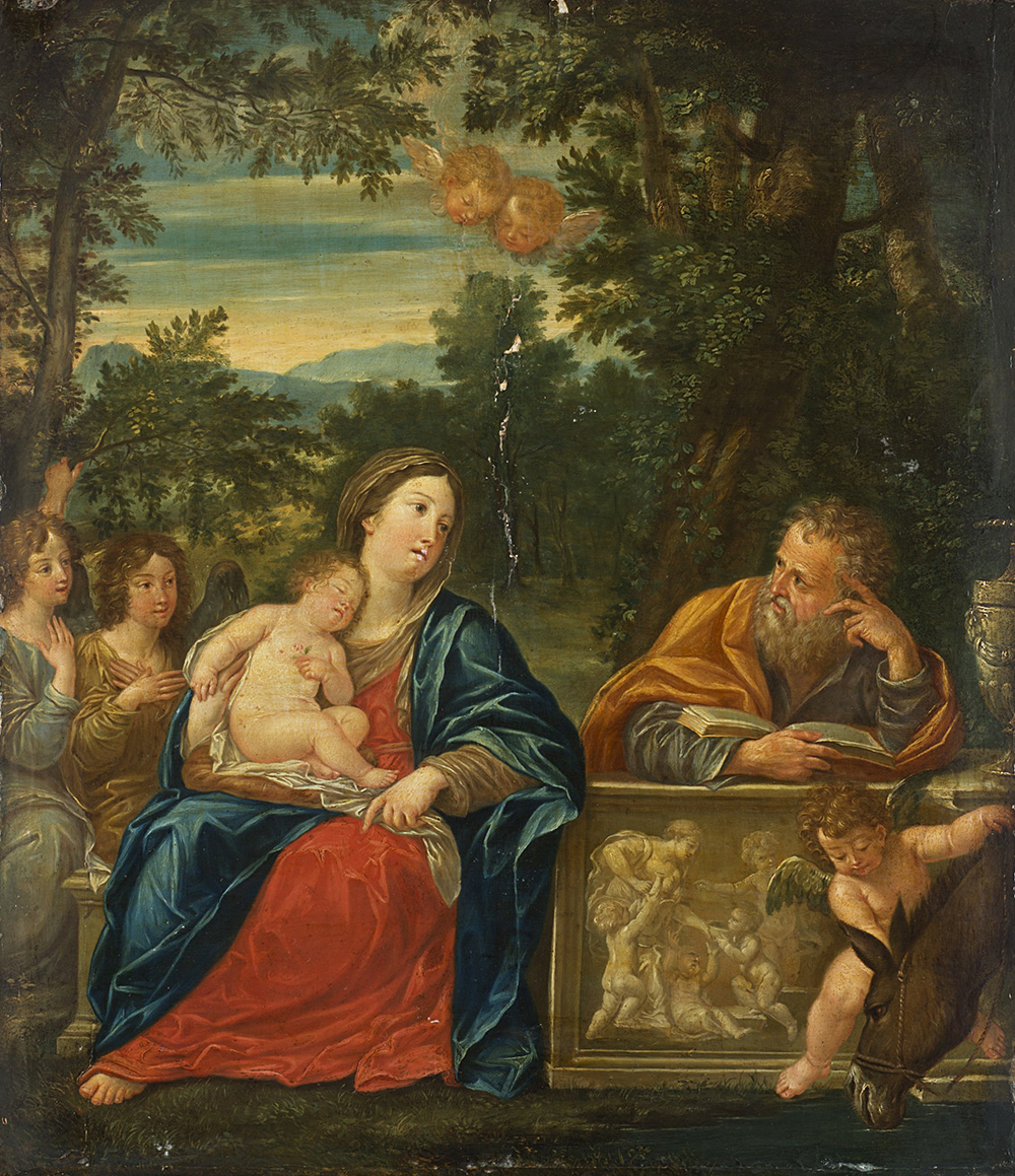 Follower of Francesco Albani, 19th-century "The Holy Family" oil on canvas (cm 52x45) elaborately-carved and gildwood frame (dects and restaurations)
