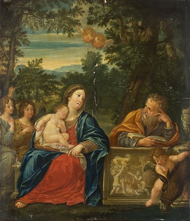 "Sacra Famiglia con angeli e putti in un paesaggio" olio su tavola (cm 52x45) entro ricca cornice in legno intagliato e scolpito con putti e racemi (difetti e restauri)