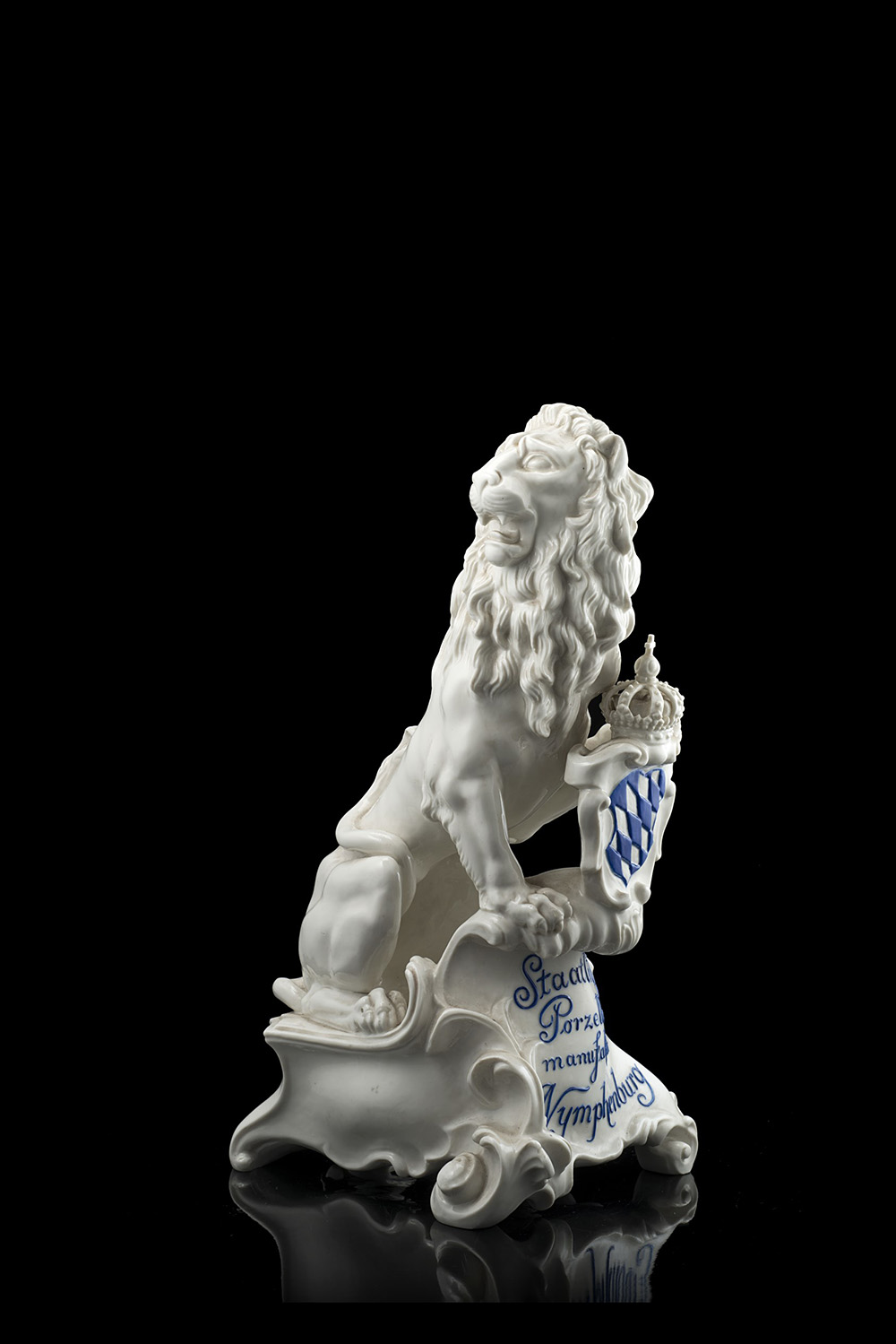 A rampant lion with a white and blue coat of arm under a white porcelain crown. Inscribed at base "Staatiche Porzellallaus Manufaktur Nymphenburg". Marked. Nymphenburg, late 19th century - early 20th century (h. cm 34)