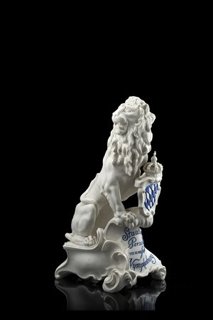 Statua raffigurante leone rampante con stemma araldico sormontato da corona in porcellana bianca su alta base barocca. L’insegna araldica è a scacchi bianco/blu. Sulla base compare la scritta "Staatiche Porzellallaus Manufaktur Nymphenburg" in blu. Marca di fabbrica. Nymphenburg, fine sec. XIX - inizio sec. XX (h. cm 34).