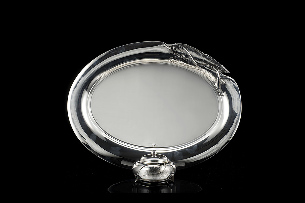 Lotto in argento composto da vassoio di forma ovale e zuccheriera di forma bombata con coperchio, con superficie liscia con sbalzi in figura di foglia di calla. Titolo argento 925/1000. Milano, sec. XX. Argentiere Poli Mario, firmati Poli Mario (vassoio cm 38,5x36,5 ca.; zuccheriera d cm 11,5 ca.) (gr tot 1770 ca.) (lievi difetti)