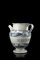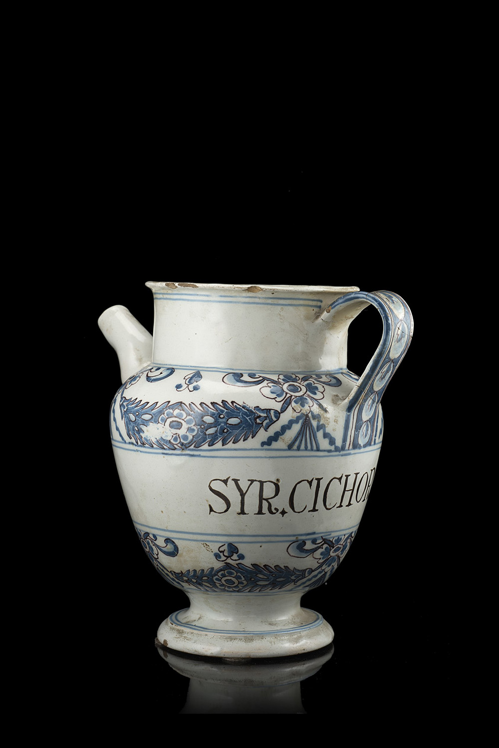 Brocca farmaceutico in maiolica a forma globulare con cannello versatore tubolare e curvato. Il manico è a nastro ed ornato con un motivo a piccoli dischi tondi su fondo blu. La decorazione è in monocromia blu profilata in bruno su smalto bianco. Il piede è espanso. La decorazione è a ghirlande di fiori e frutti a festone, sorretti in alto da fiocchi con nappe. Al centro corre la scritta farmaceutica in lettere capitali brune ‘SYR. CICHOR. C. RHAB’ (sciroppo di cicoria composto con rabarbaro). Esemplari simili sono al Museo Civico di Bassano del Grappa. Bassano, manifattura Manardi, sec. XVII/XVIII (h. cm 20) (difetti)