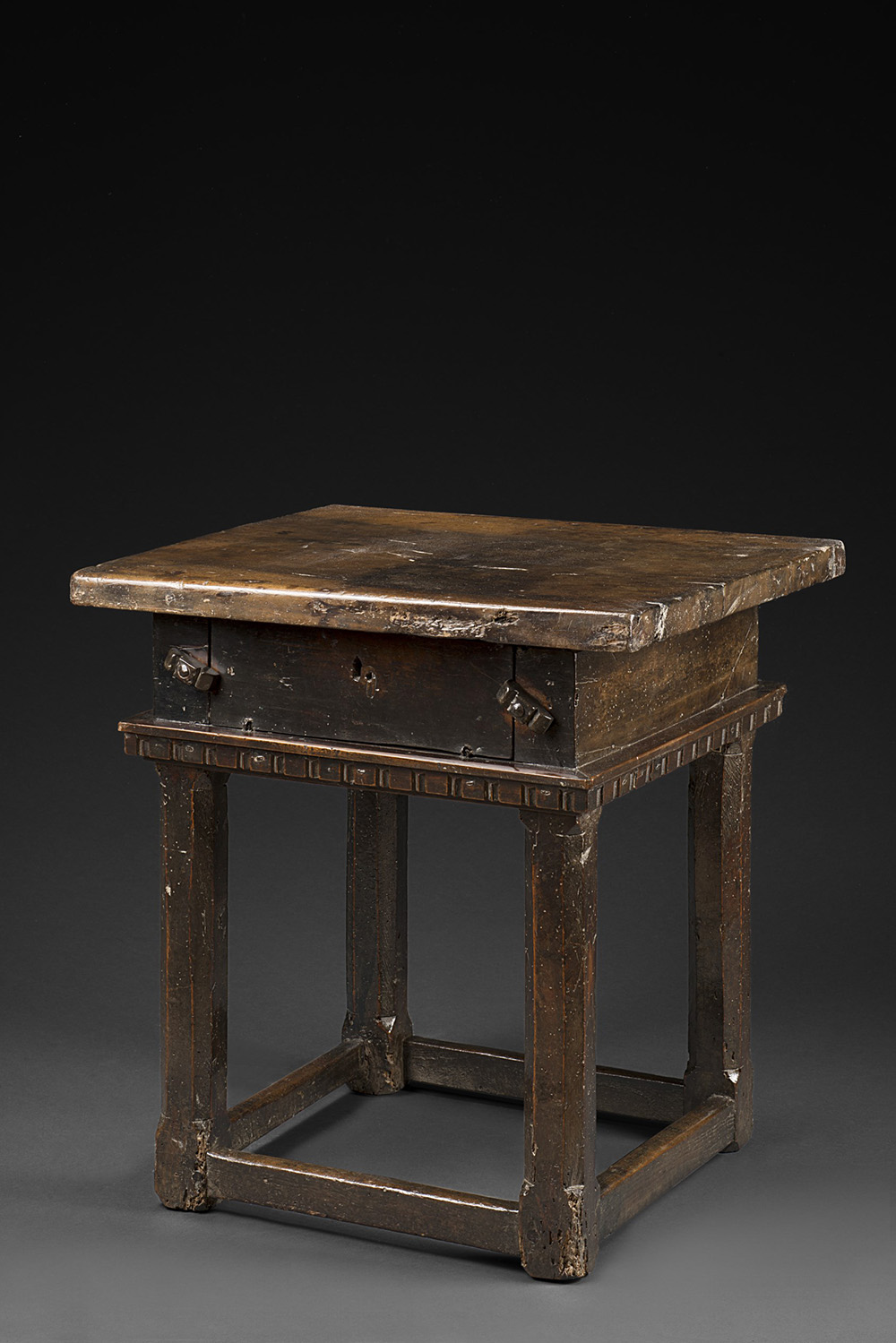 Tavolino basso da lavoro di forma rettangolare. Antina ribaltabile nella fascia, gambe sfaccettate unite da traverse. Sec. XVII (cm 65x67x58) (difetti e mancanze)