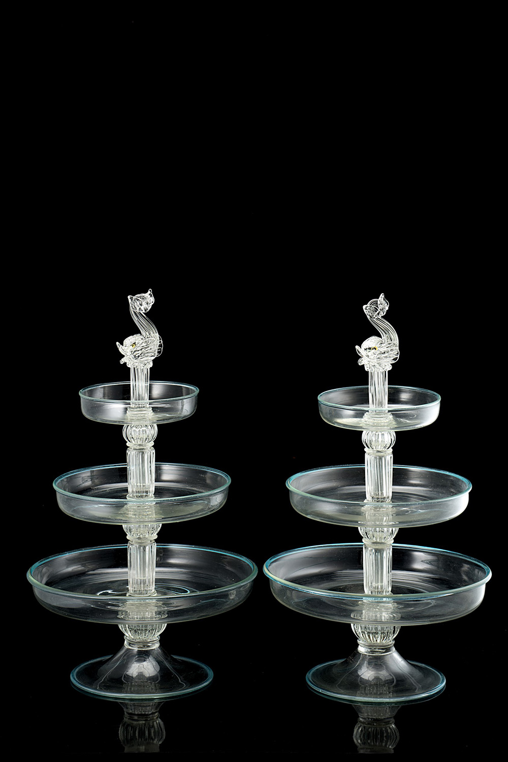 Manifattura di Murano inizio sec. XX. Coppia di alzate centrotavola in vetro incolore con fusto a colonna scanalata sormontata da delfini (h. cm 52) (difetti)