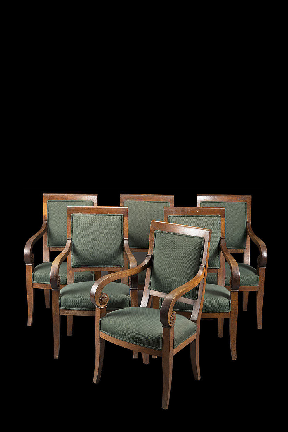 Sei poltrone in noce con braccioli terminanti a ricciolo decorati con rosone intagliato. Gambe anteriori mosse. Sec. XIX. Rivestite in tessuto verde (difetti)