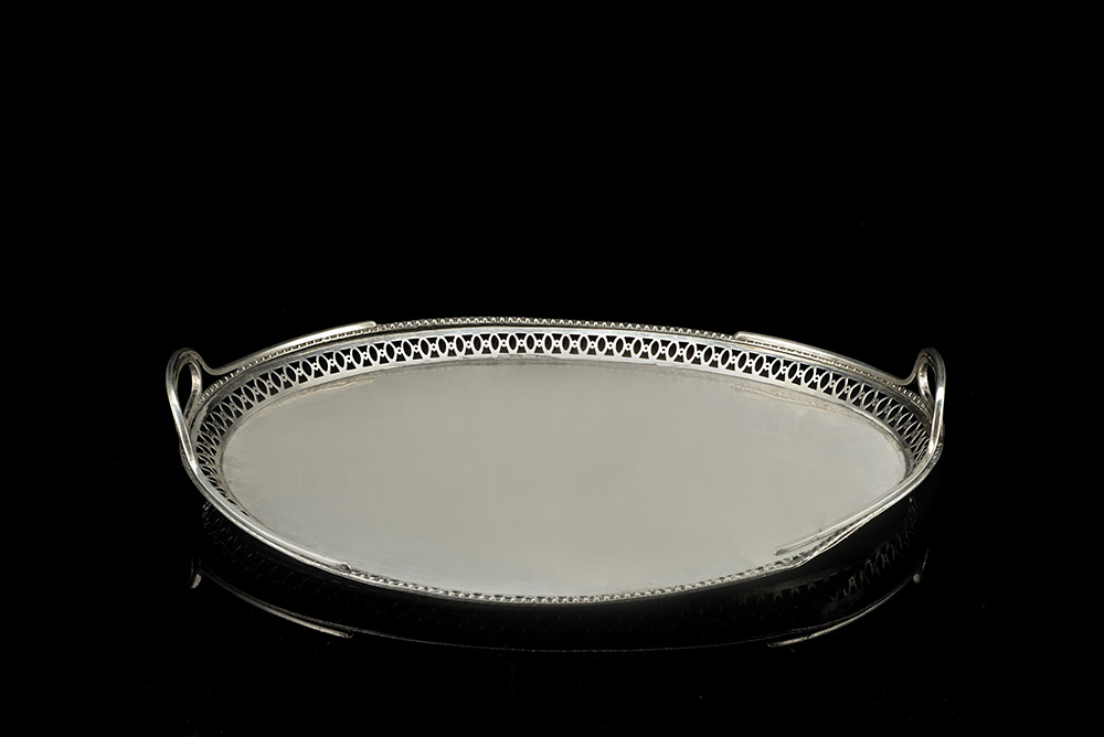 Vassoio biansato in argento con ringhiera traforata e bordo perlinato. Hanau...