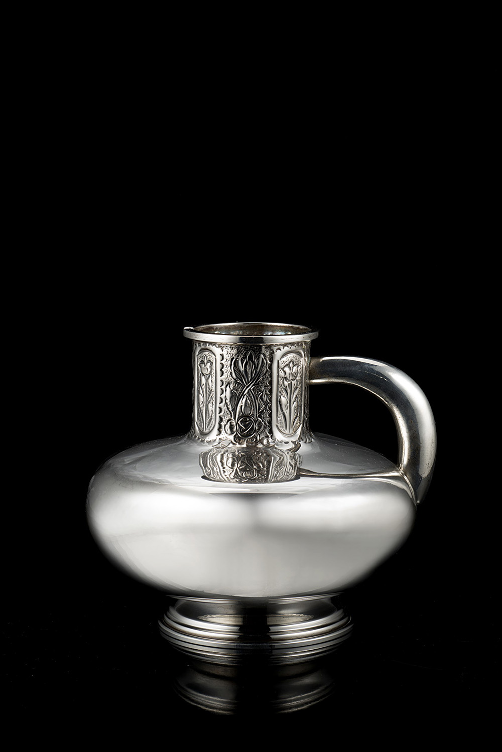 Caraffa "oinochòe" in argento con collo cesellato a motivi floreali. Marcata...