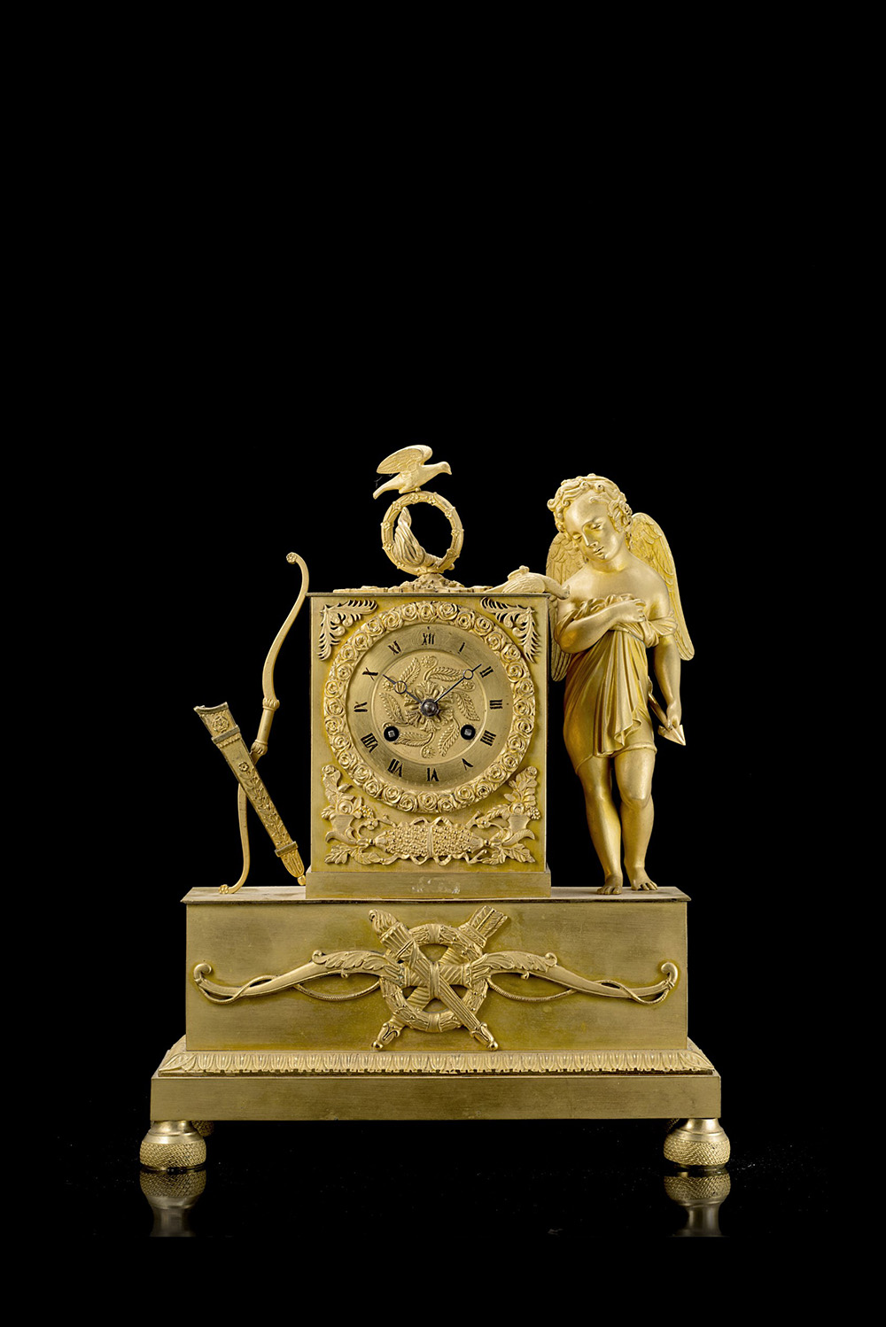 Pendola in bronzo dorato sormontata da figura alata e volatile