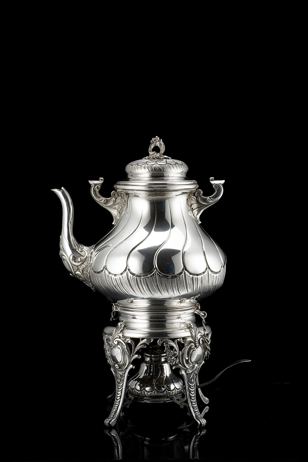 Samovar in argento con supporto a quattro piedi, fornello e colino, decorato...