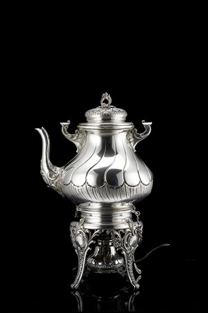 Samovar in argento con supporto a quattro piedi, fornello e colino, decorato a baccellature mosse, fasce zigrinate e volute fogliate. Italia, fine sec. XIX-inizi sec. XX. Confalonieri gioielliere Milano-Roma (mancante del manico) (h. cm 36 ca.) (gr 1940 ca.) (difetti)