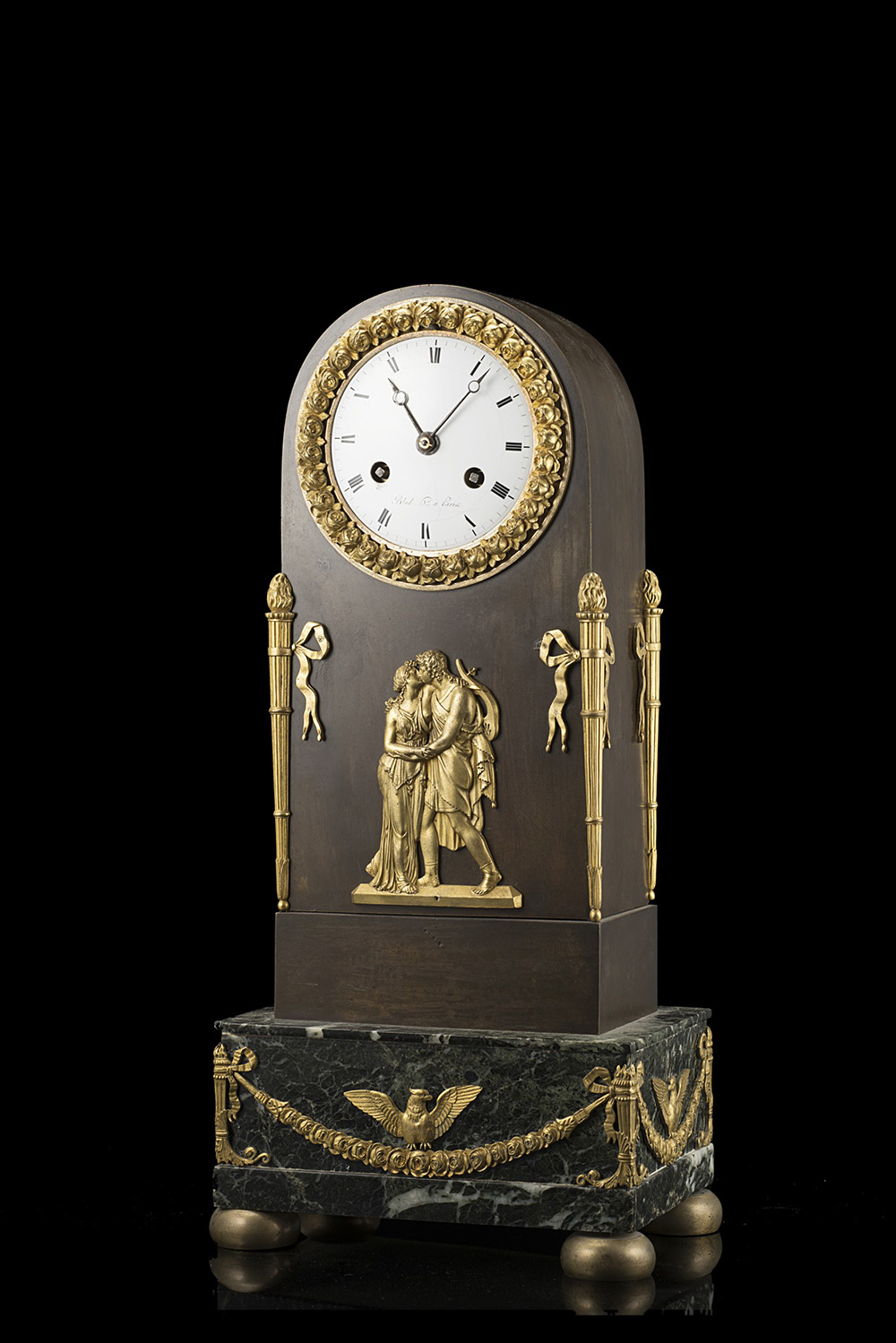 Ormolu and patinated bronze mantel clock with green marble of the Alps base
