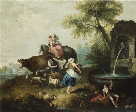 Seguace di Francesco Zuccarelli "Pastori e donne alla fontana" olio su tela...