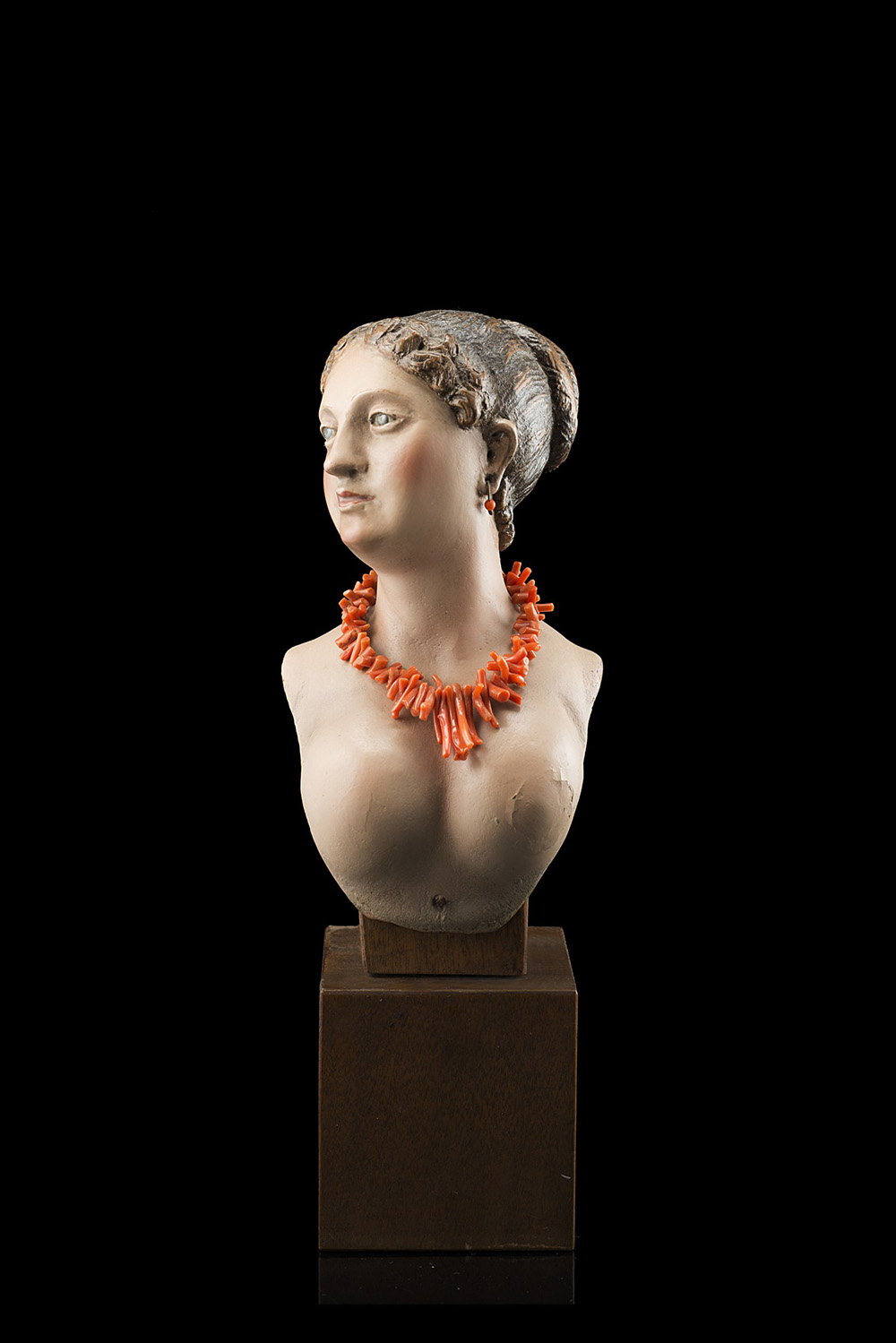 Neapolitan school, 18th century. A wooden female bust with glass eyes and coral necklace. On wooden base (h. cm 17) (defects and losses)