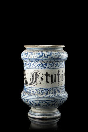 Albarello in maiolica in forma di rocchetto con parte centrale rastremata. Piede svasato espanso. Decorazione in monocromia turchina con un motivo a larghi girali fogliati stilizzati che terminano con fiori sfrangiati. Scritta farmaceutica in caratteri gotici bruno manganese ‘Ung. tutie’ . Italia settentrionale, sec. XVII/XVIII (h. cm 19) (difetti e mancanze)