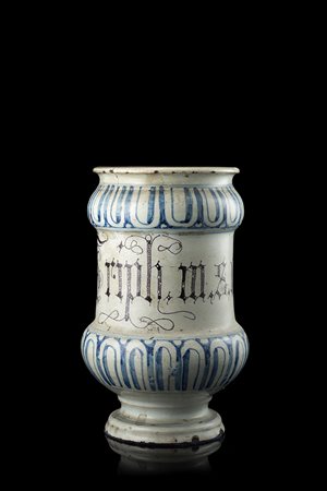 Albarello in maiolica a forma di rocchetto con decorazione a baccelli in monocromia turchina su smalto bianco. Al centro compare la scritta del contenuto farmaceutico in lettere gotiche brune. Piede svasato ed espanso. Italia settentrionale, Veneto, sec. XVIII (h. cm 20) (difetti)
