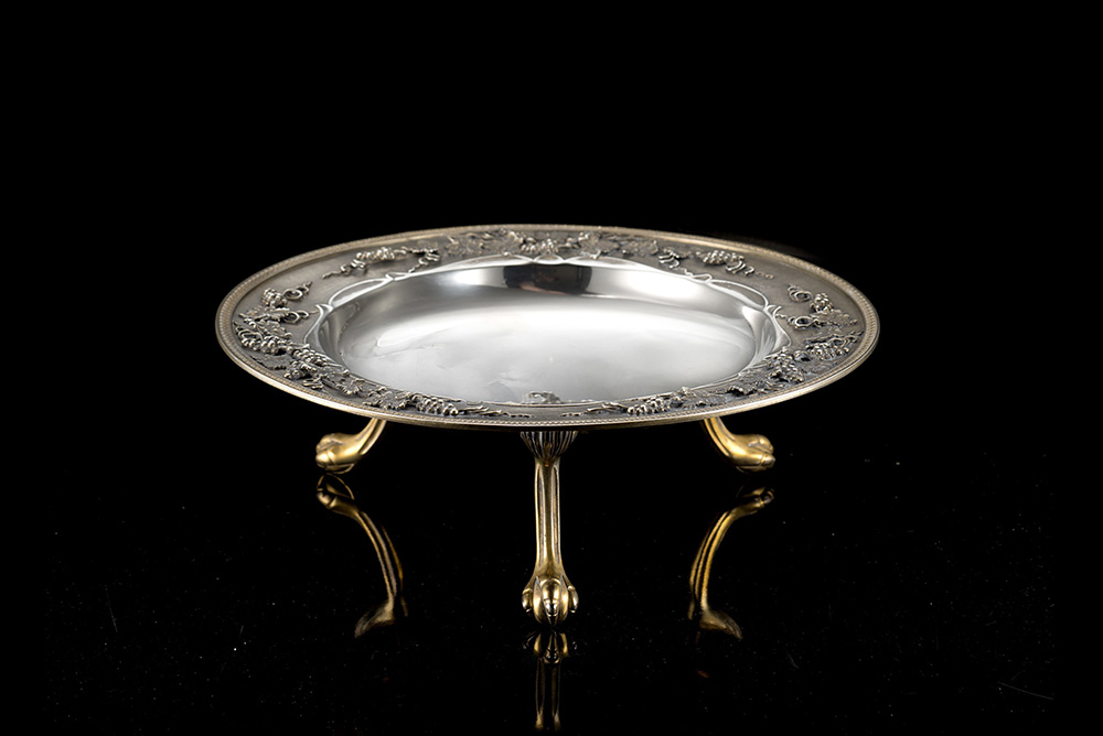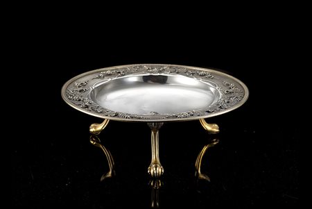 Alzata tripode in argento di forma circolare, con fondo liscio e tesa decorata da applicazioni di tralci d'uva su sfondo zigrinato; bordo godronato e piedini ad artiglio su sfera. Londra, 1909. Argentiere Elkington & Co (cm 25,4x8,4 ca.) (gr 890 ca.) (difetti)