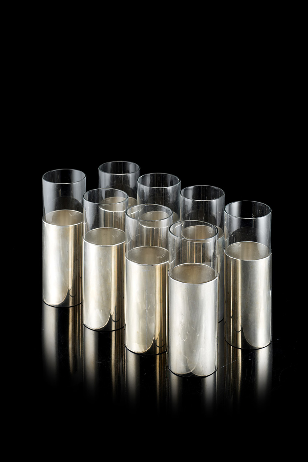 Otto porta bicchieri in argento con vetri pertinenti, di forma cilindrica a superficie liscia. Milano, sec. XX. Argentiere Dabbene (h. cm 12 ca.; d. cm 6,4 ca.) (gr 1130 ca.) (lievi difetti)
