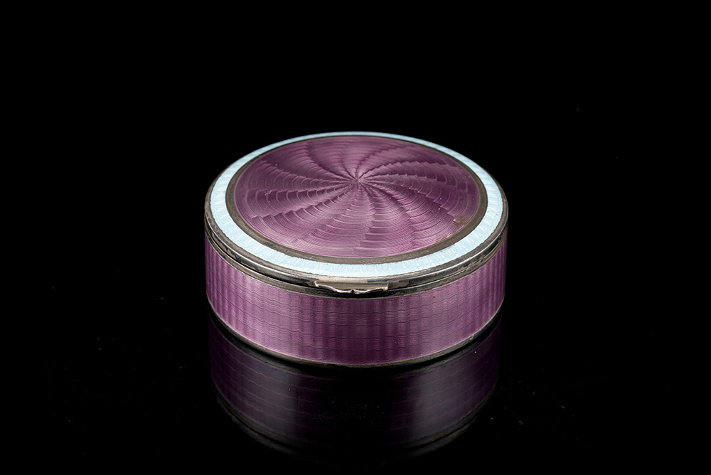 Scatola in argento di forma circolare con superficie decorata a guillochè e smalto traslucido viola e azzurro; interno in vermeil. Italia (?), inizi sec. XX (d. cm 10, h. cm 4 ca.) (gr 240 ca.) (lievi difetti)