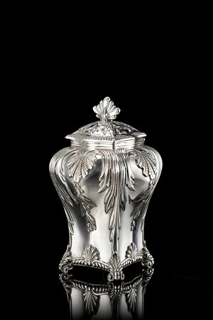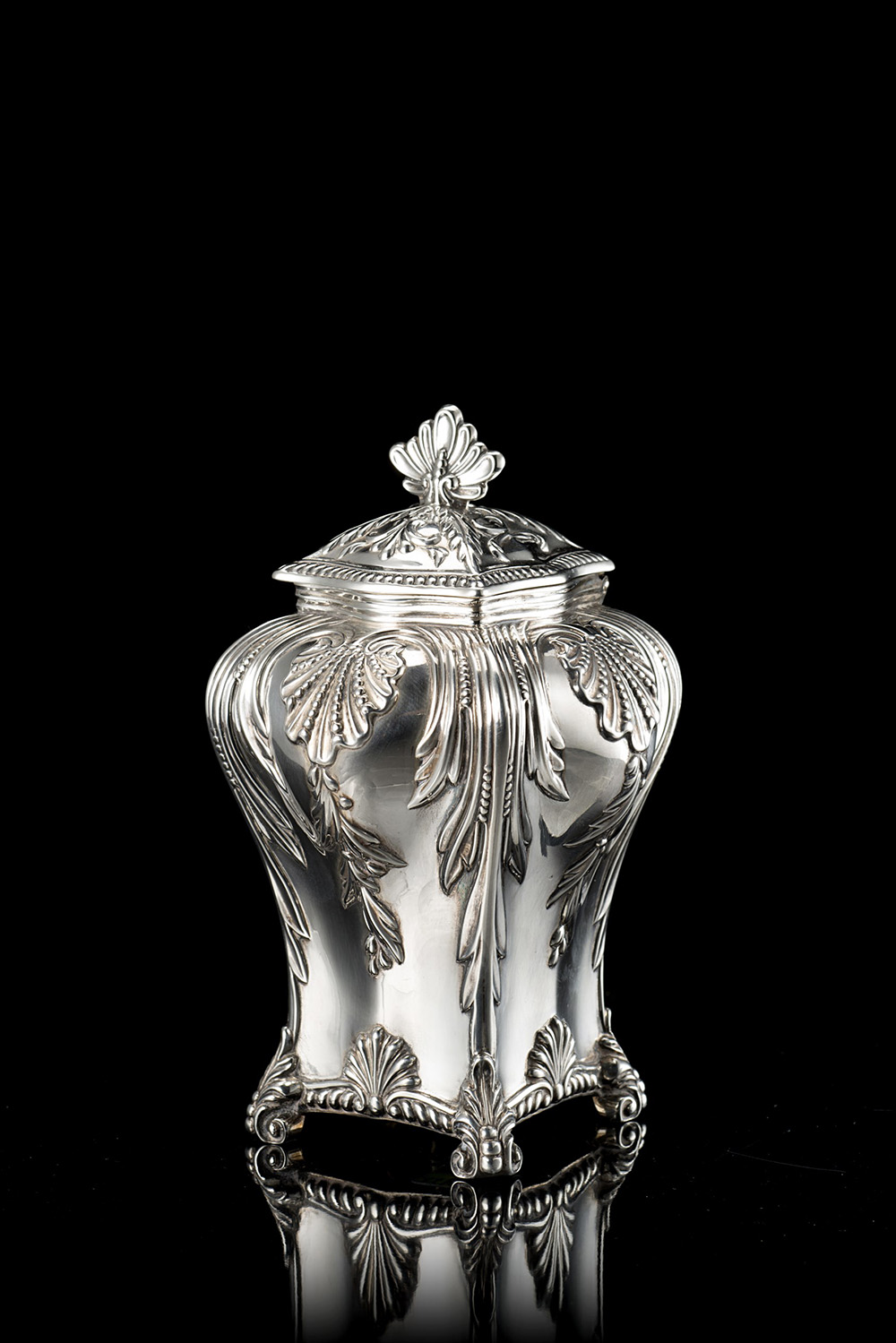 Scatola porta tè in argento, con corpo quadrangolare ad alta spalla, bombato e costolato, decorata a cartelle di motivi floreali, conchiglie e perlinature; piedini a ricciolo e coperchio con presa fogliata. Londra, 1899. Argentiere Thomas Bradbury & Sons (h. cm 14,5 ca.) (gr 240 ca.) (lievi difetti)