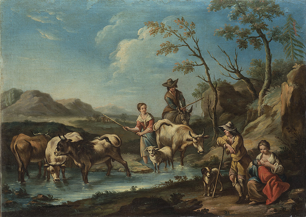 18th-century master "Landscape with herdsman" oil on canvas (cm 49x69) framed (defects)
