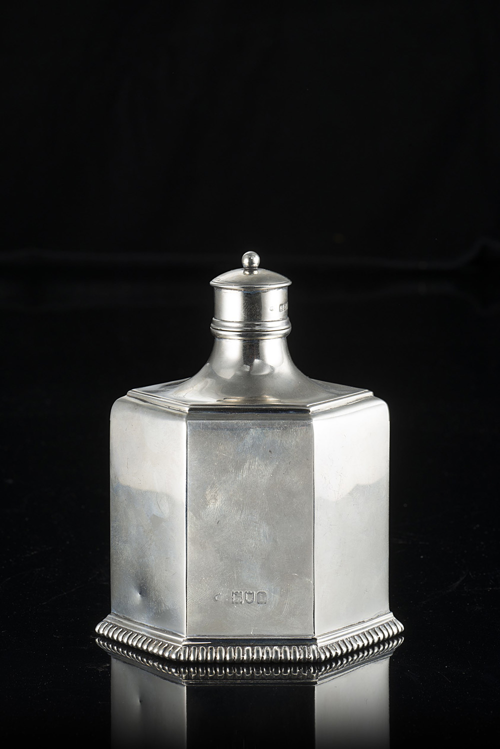 Scatola porta tè (tea caddy) in argento di forma esagonale, con superficie liscia e base godronata. Londra, 1904. Argentiere William Comyns (h. cm 13 ca.; lungh. cm 10,5 ca.) (gr 230 ca.) (lievi difetti)