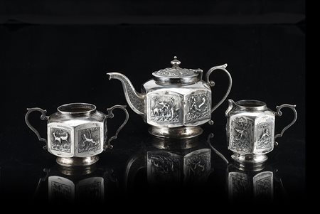 Servizio in argento composto da teiera, lattiera e zuccheriera di forma esagonale decorato con figure di animali entro riserve. Birmania (?) (gr 590 ca.) (h. cm 10xl. cm 18 ca.) (difetti)