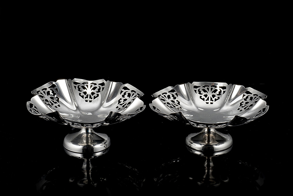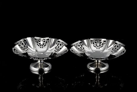 Coppia di piccole alzate in argento con corpo circolare esalobato traforato. Città di Sheffield, 1956. Argentiere Viner's Ltd (Emile Viner) (cm 14,5x5 ca.) (gr tot 240 ca.) (lievi difetti)