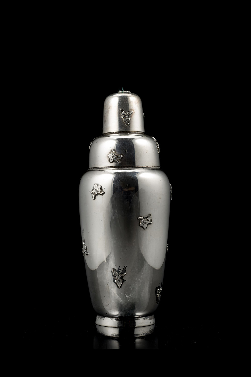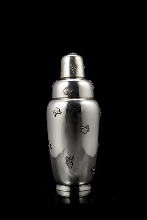Shaker in argento con superficie liscia ed applicazioni ‘cut card’ di tralci d’uva; corpo con coperchio filtrante rimuovibile e tappo. Italia, metà sec. XX, marcato Faccioli (h. cm 23,5 ca.) (gr 560 ca.) (difetti)