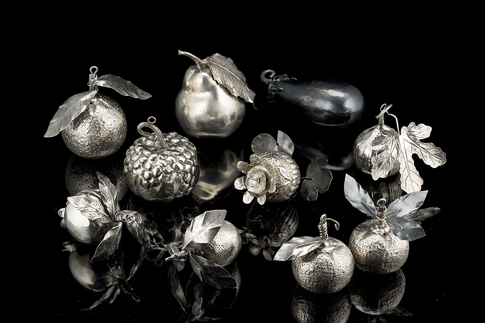 A set of ten silver models of fruits. Italy, 20th century (l. max cm 14.5 ca.) (gr 840 ca.) (defects)