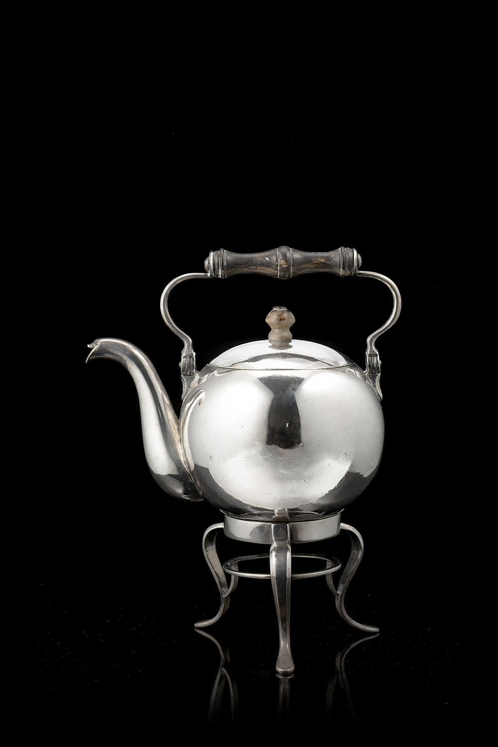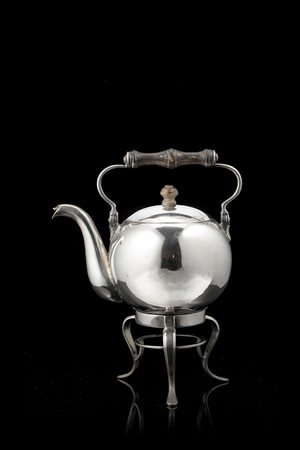 Piccolo samovar in argento di forma sferica con superficie liscia, supporto tripode, manico e pomolo in legno tornito. Area germanica, possibile manifattura austro-ungarica, inizi sec. XIX (h. con manico cm 20 ca.) (gr lordi 500 ca.) (lievi difetti)