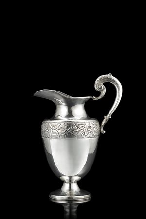 Caraffa in argento 925/1000 con corpo ovoidale decorato con fascia a motivi floreali; piede circolare, versatoio sagomato, manico a voluta fogliata. Messico, metà sec. XX (h. max cm 31 ca.) (gr 1220 ca.) (difetti)