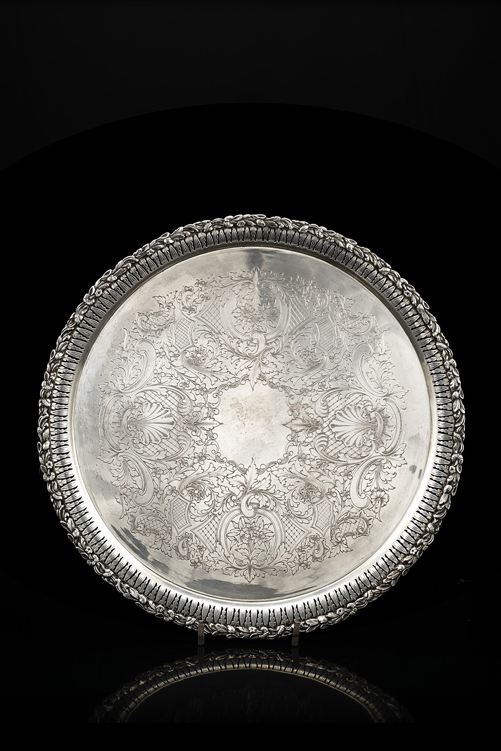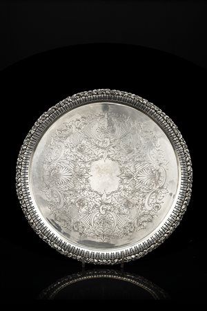 Vassoio in argento di forma circolare con fondo inciso, sponda traforata e...