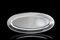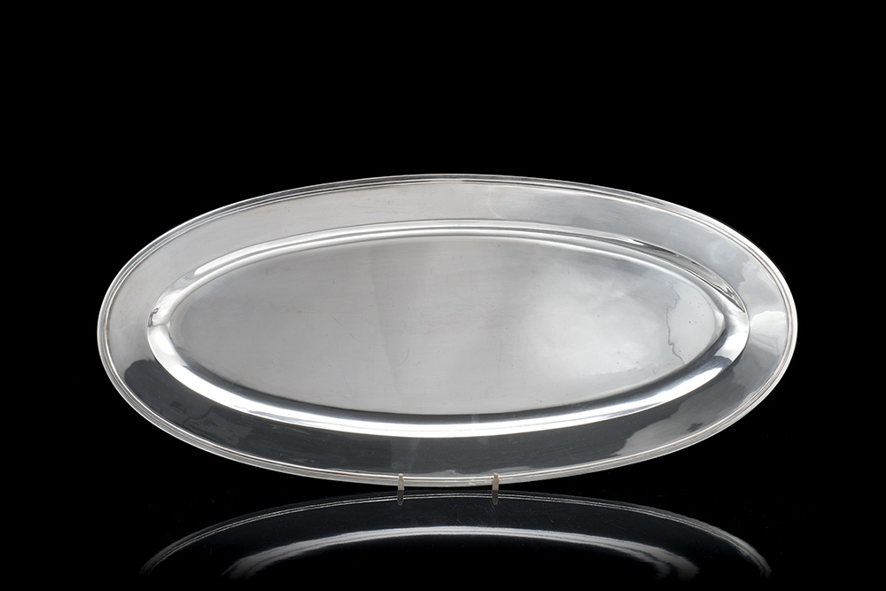 Vassoio in argento di forma ovale con superficie liscia e bordura modanata....