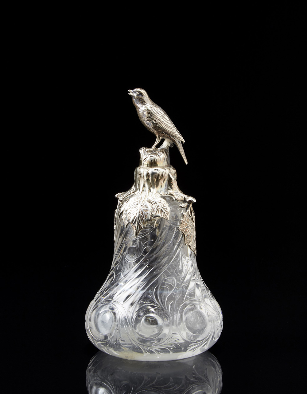 Nebulizzatore per profumo in vetro con ghiera in argento sbalzato a foglie e volatile a tutto tondo. Londra, 1890. Argentiere Edwuard H Stockwell (?) (h. cm 18)