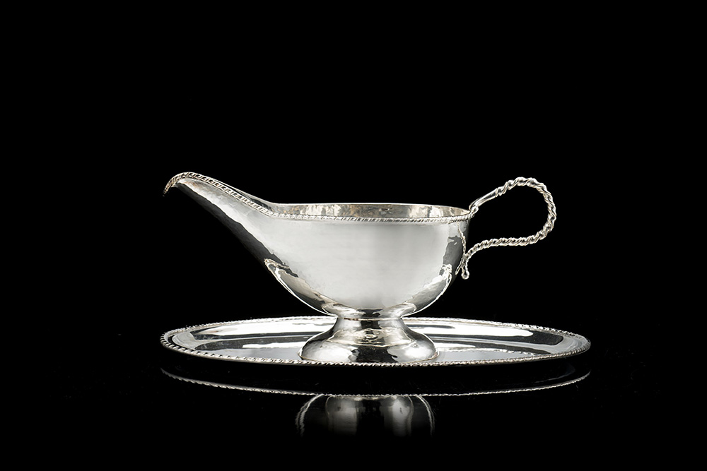 Salsiera con vassoio, in argento, di forma ovale con bordure e manico cordonati, in stile San Marco. Italia, metà sec. XX (lungh. max cm 25 ca.; h. cm 10,5 ca.) (gr 410 ca.)