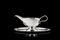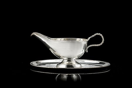 Salsiera con vassoio, in argento, di forma ovale con bordure e manico...