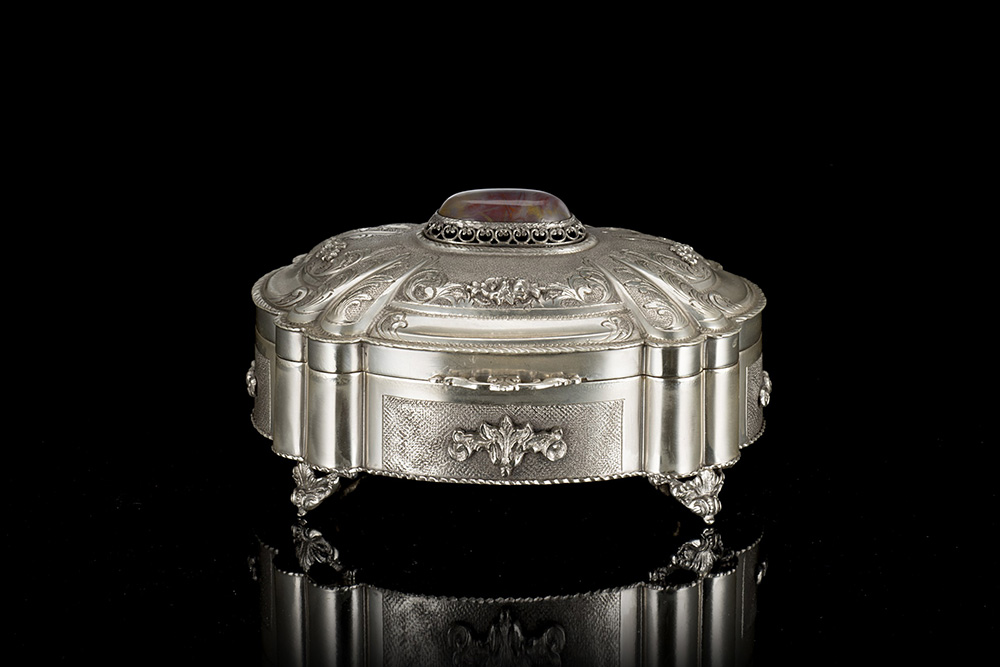 Scatola in argento di forma ovale sagomata decorata con motivi fogliati su fondo zigrinato, applicazioni e piedini floreali, cabochon in pietra dura. Italia, inizio sec. XX (gr lordi 390 ca.) (cm 14,5x12xh. cm 8) (difetti)