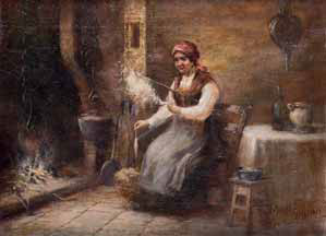 Giuseppe Moscardini Attivo nella prima metà del XX secolo LA FILATRICE olio su tela, cm 32x43. Firmato in basso a destra: G. Moscardini